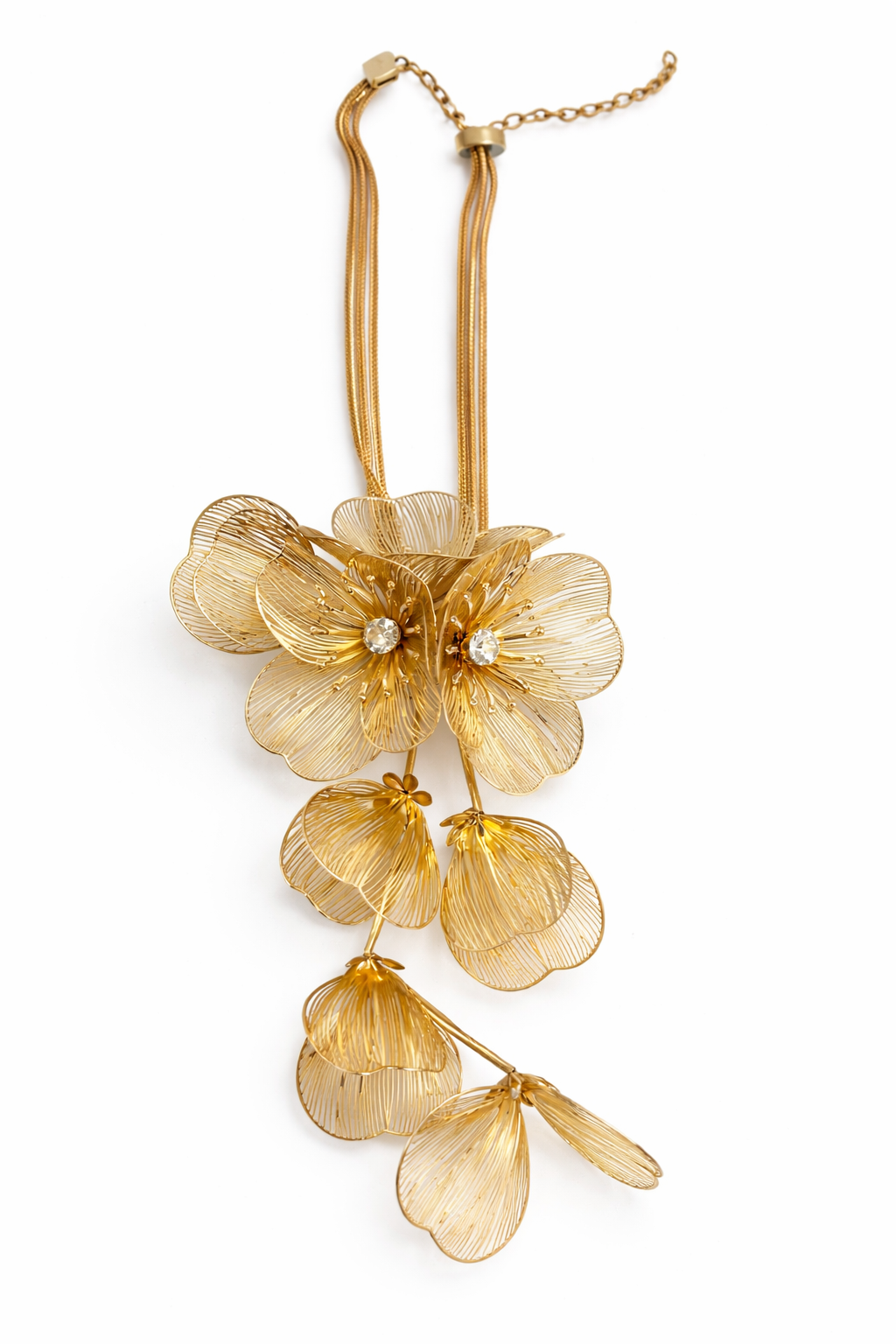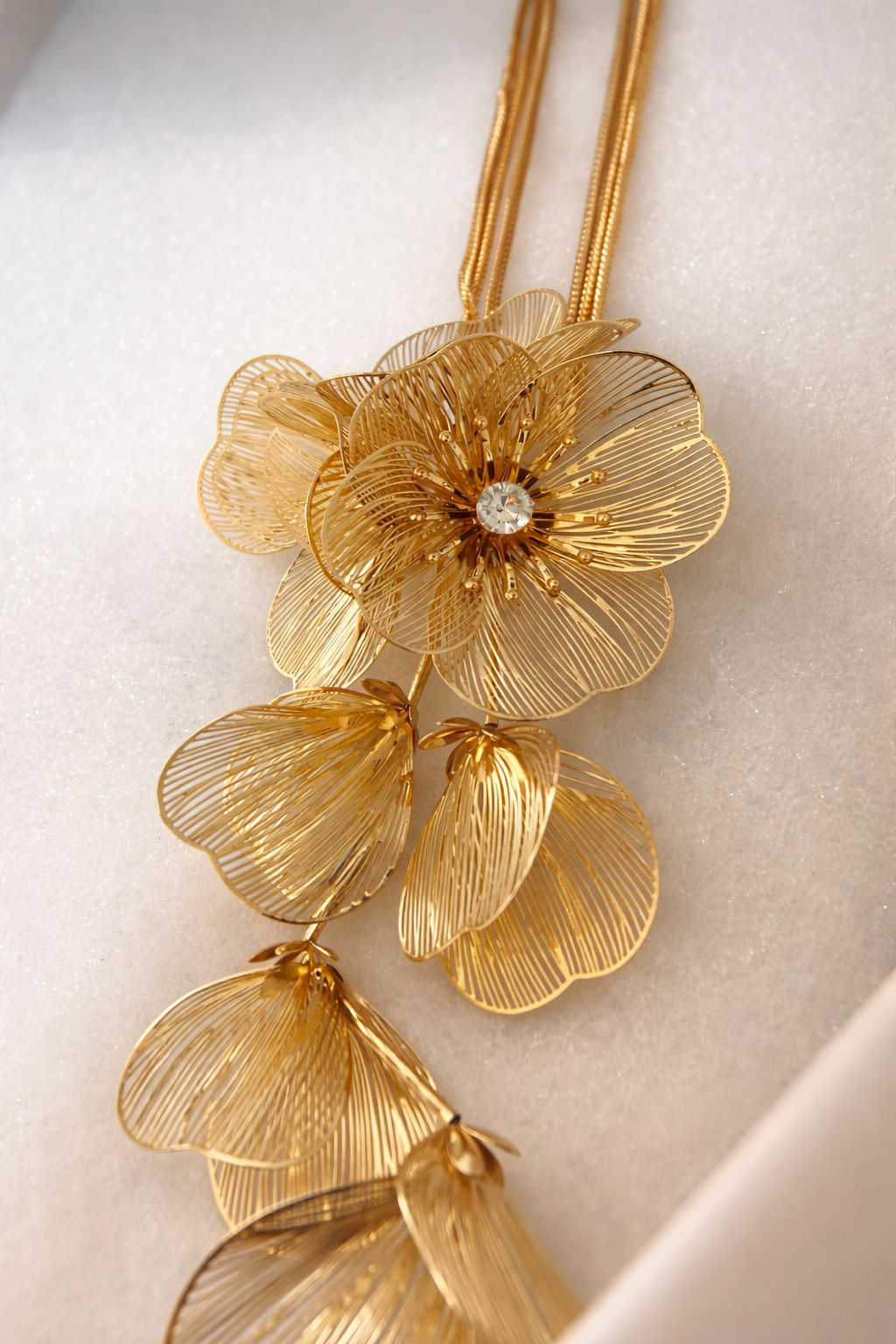 The Havilah Necklace is a radiant, lightweight statement crafted in luminous gold. Its cascading floral design features finely sculpted petals that catch the light with soft movement and shine. Effortless yet striking, it drapes beautifully for an elevated finish that feels as graceful as it looks.