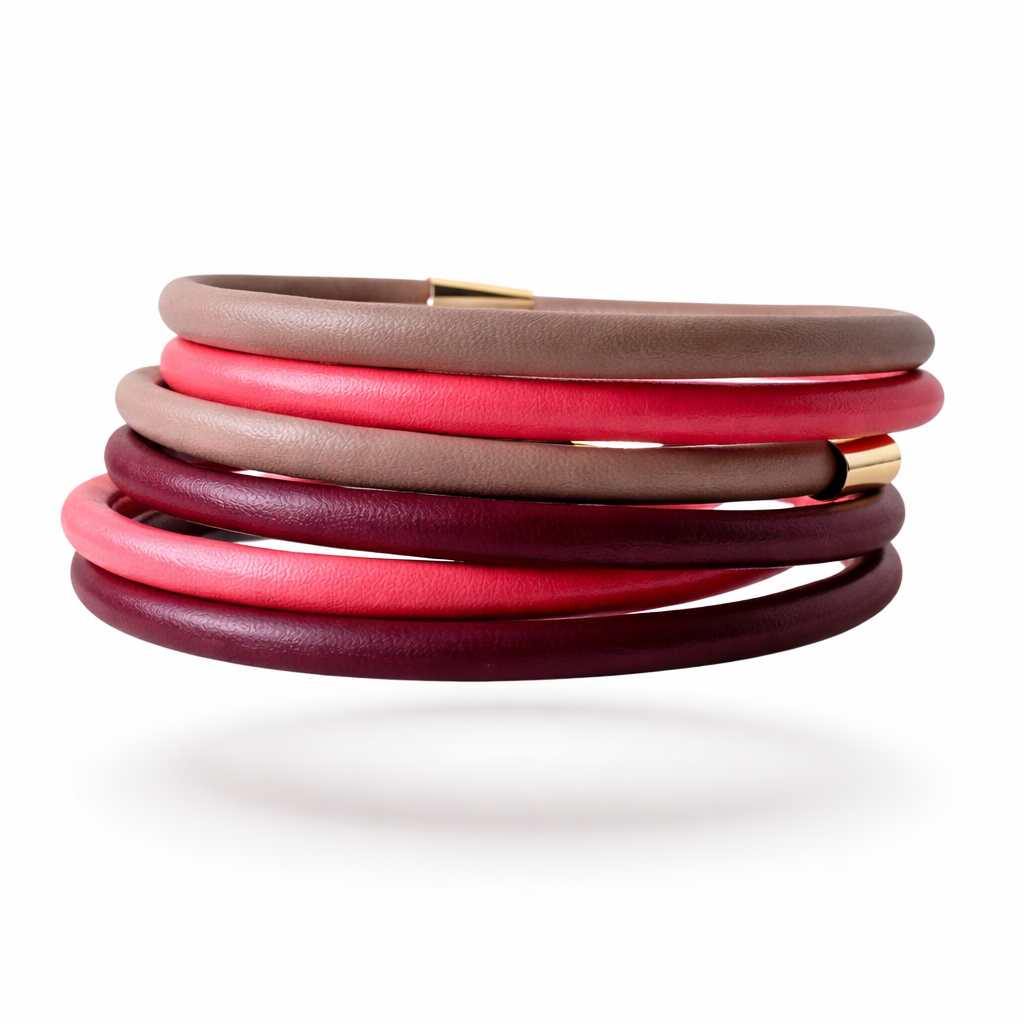 Add a pop of color to your outfit with these Heartfelt (faux) leather bangles. Made with multi-colored faux leather, these bangles bring a touch of fun and personality to any look. Upgrade your style game and make a statement with these vibrant and versatile accessories.