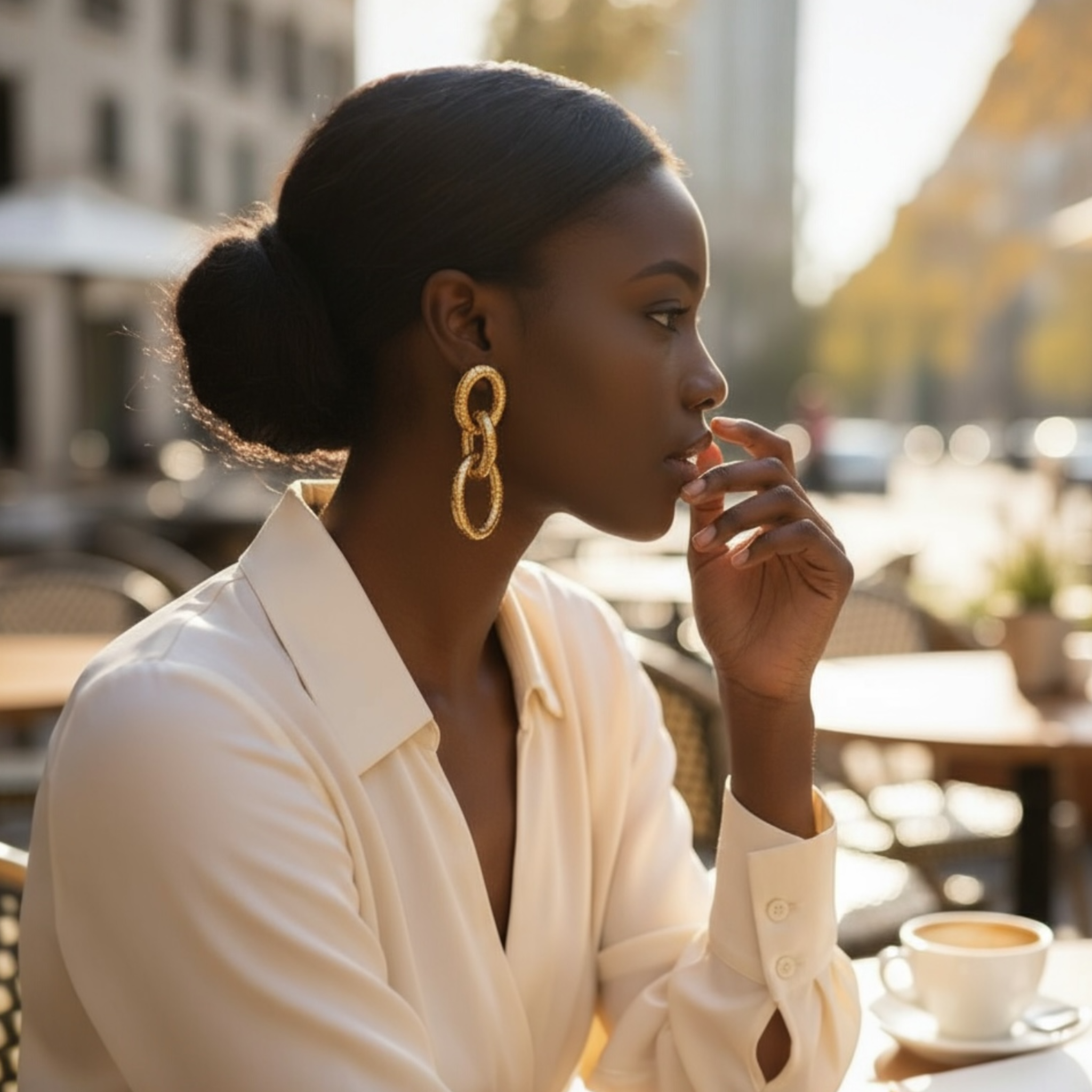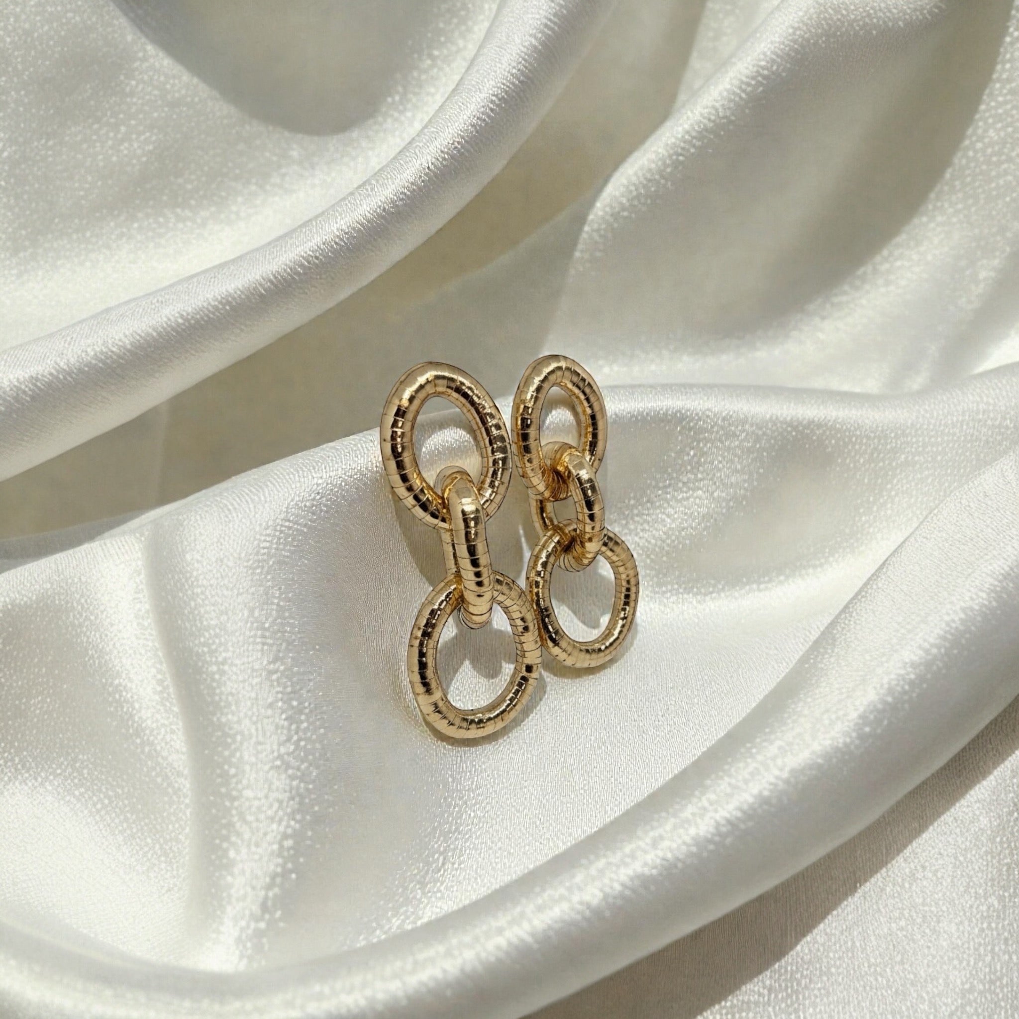 Sleek textured 3 tier gold earrings hanging neck length and perfect for day to evening wear, light weight and show stopping