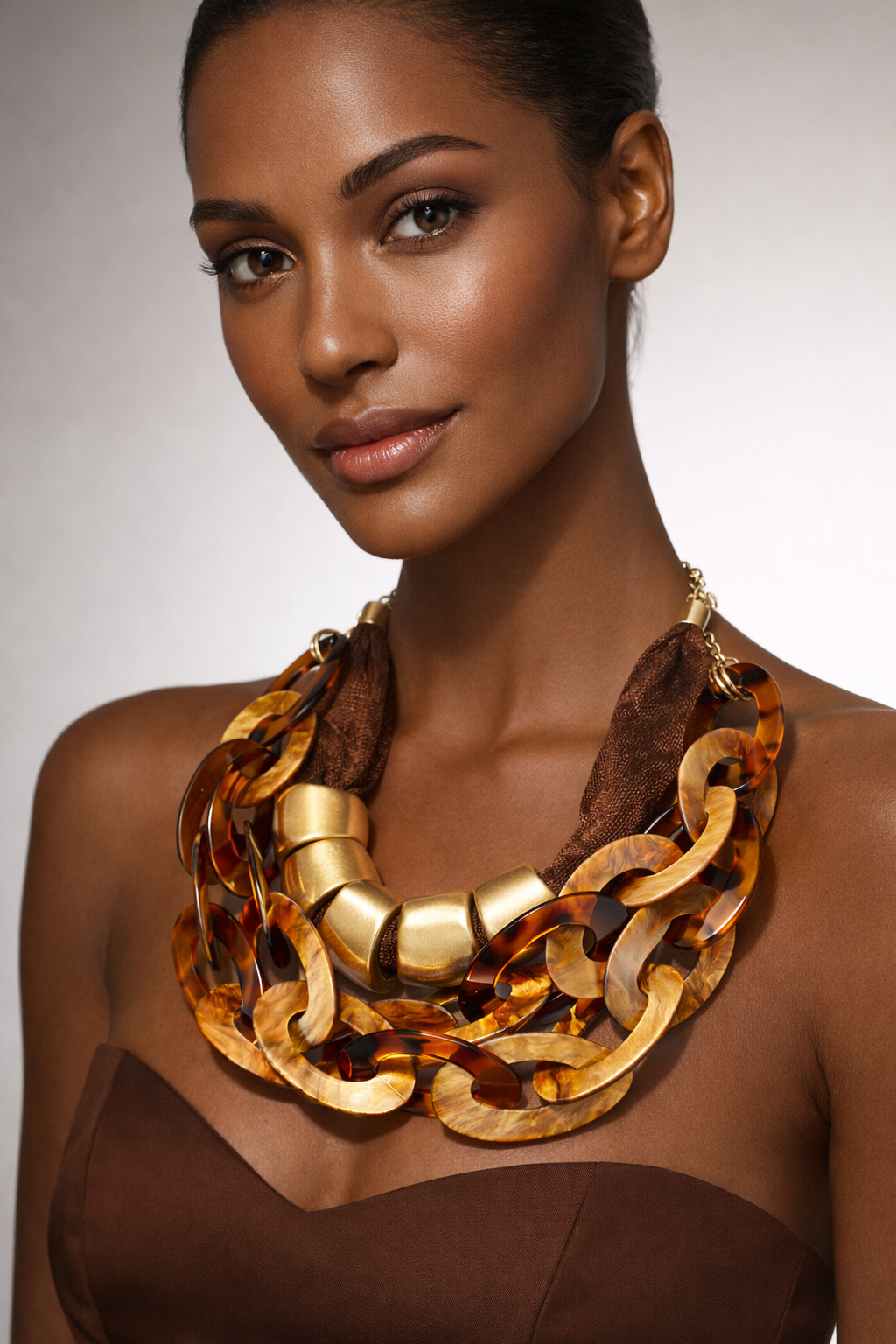The Oh Shelah Necklace is a bold yet refined statement of warmth and elegance. Layered tortoise shell links meet brushed gold accents and soft fabric detailing, creating rich texture and fluid movement. Lightweight yet striking, it rests effortlessly at the neckline, adding depth and quiet sophistication to any look.