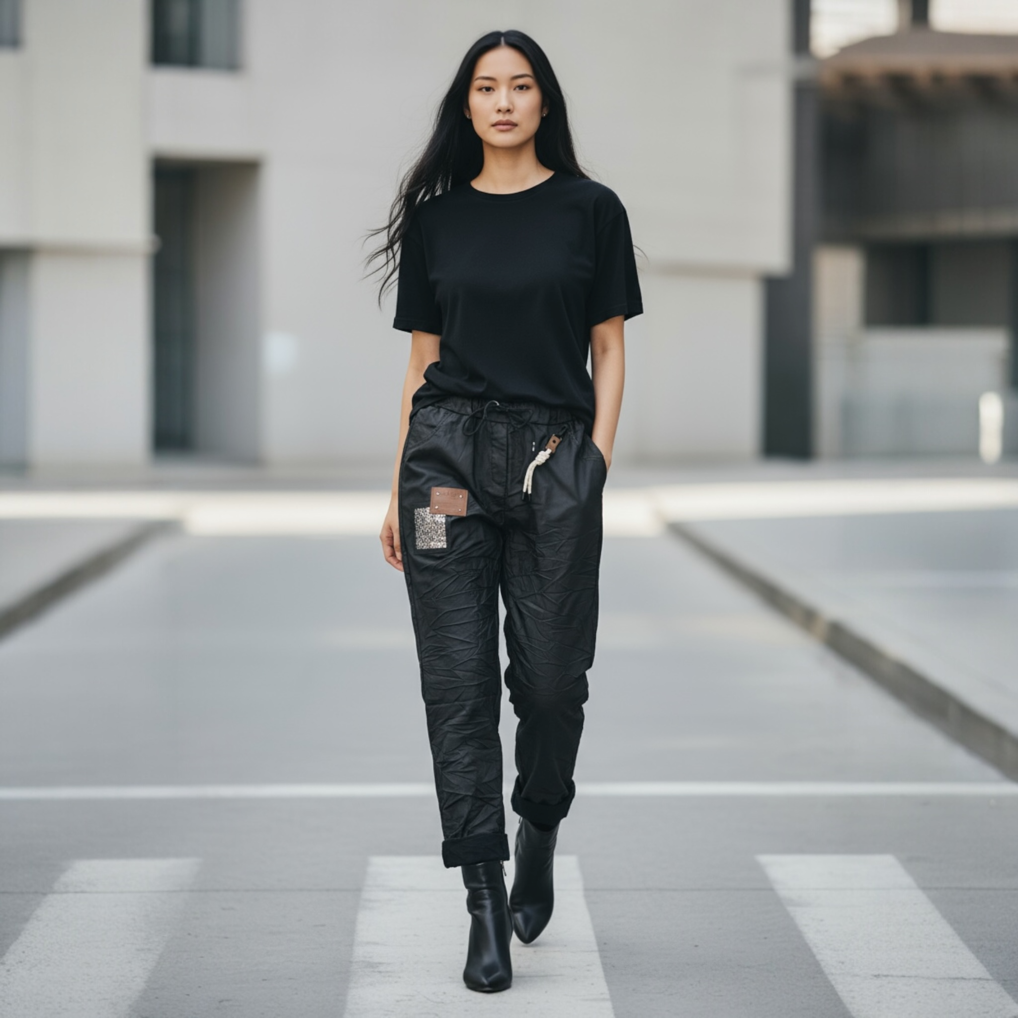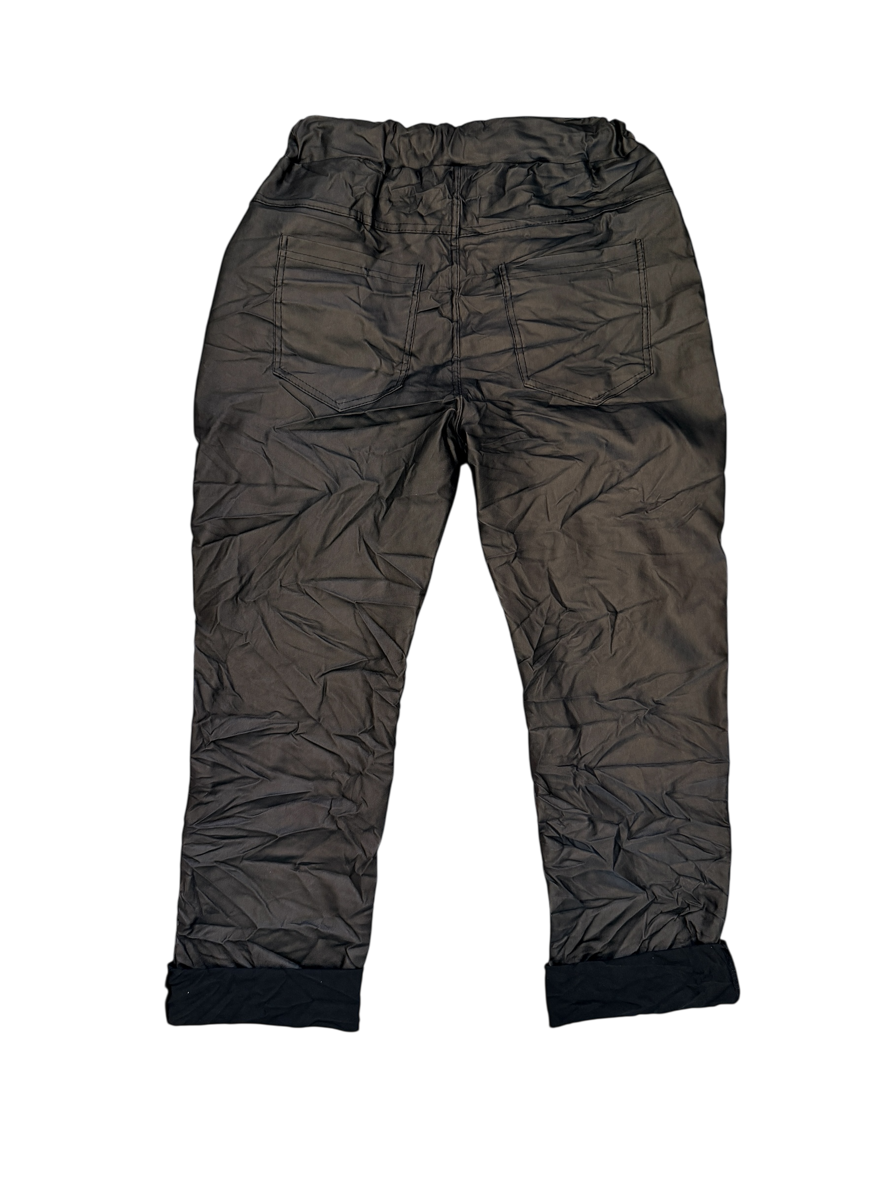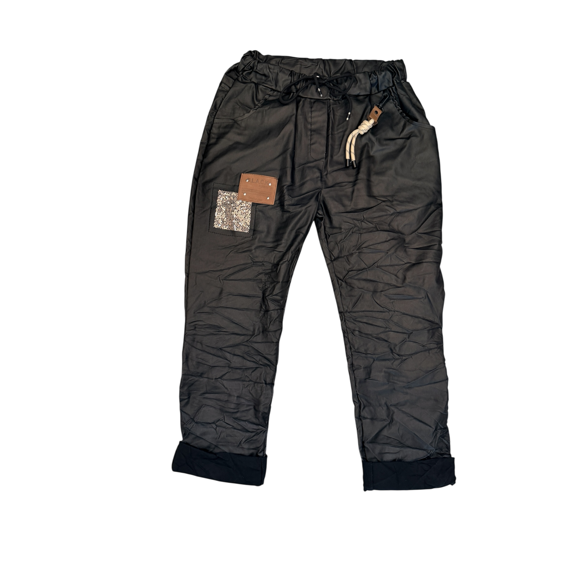Make a bold statement with these Italian black wrinkled cuffed faux leather pants. Featuring eye-catching sequined accents and edgy patchwork, they’re designed for the fearless woman who refuses to blend in. Perfect for adding attitude to your look while staying on trend.